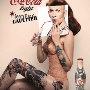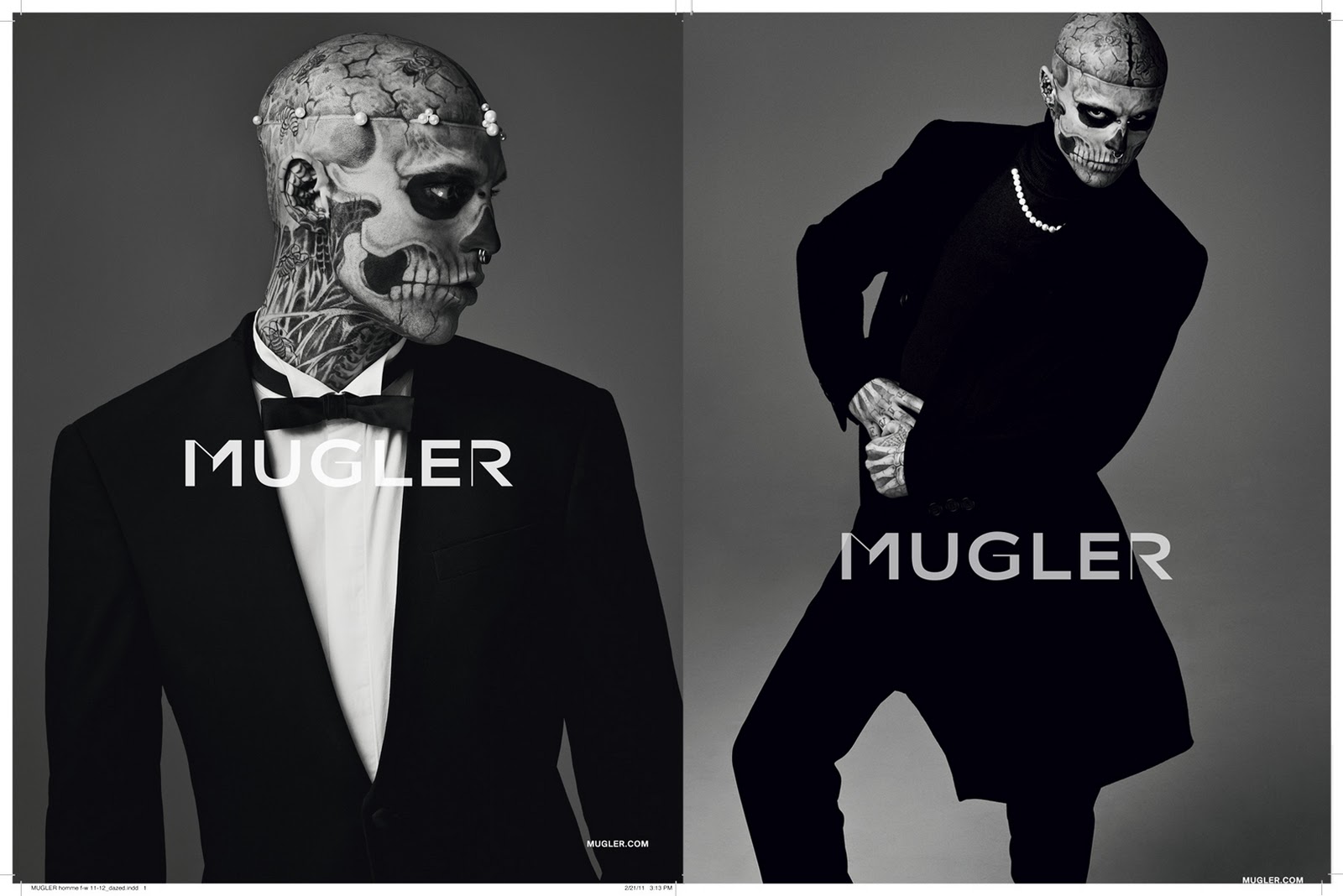 De gauche à droite : Rick Genest (Zombie Man) égérie Mugler, campagnes Loverdose Diesel, Love Moschino et Jean-Paul Gaultier / Coca-Cola